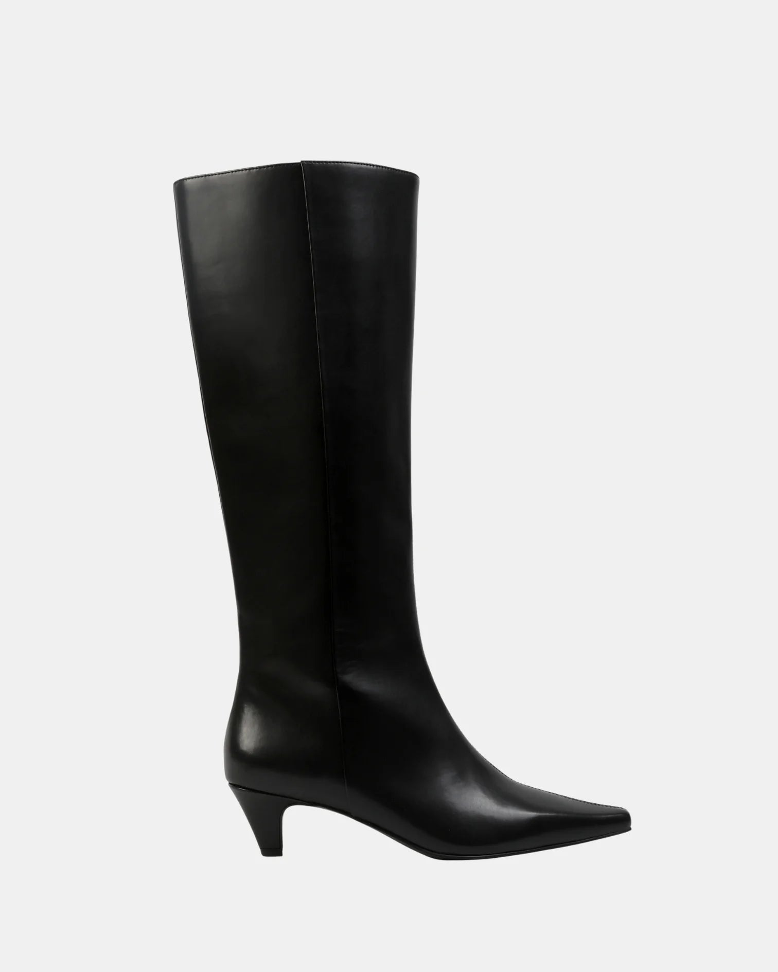 The Leni Knee High Boot, wide vintage style with a slanted heel and narrow square toe.